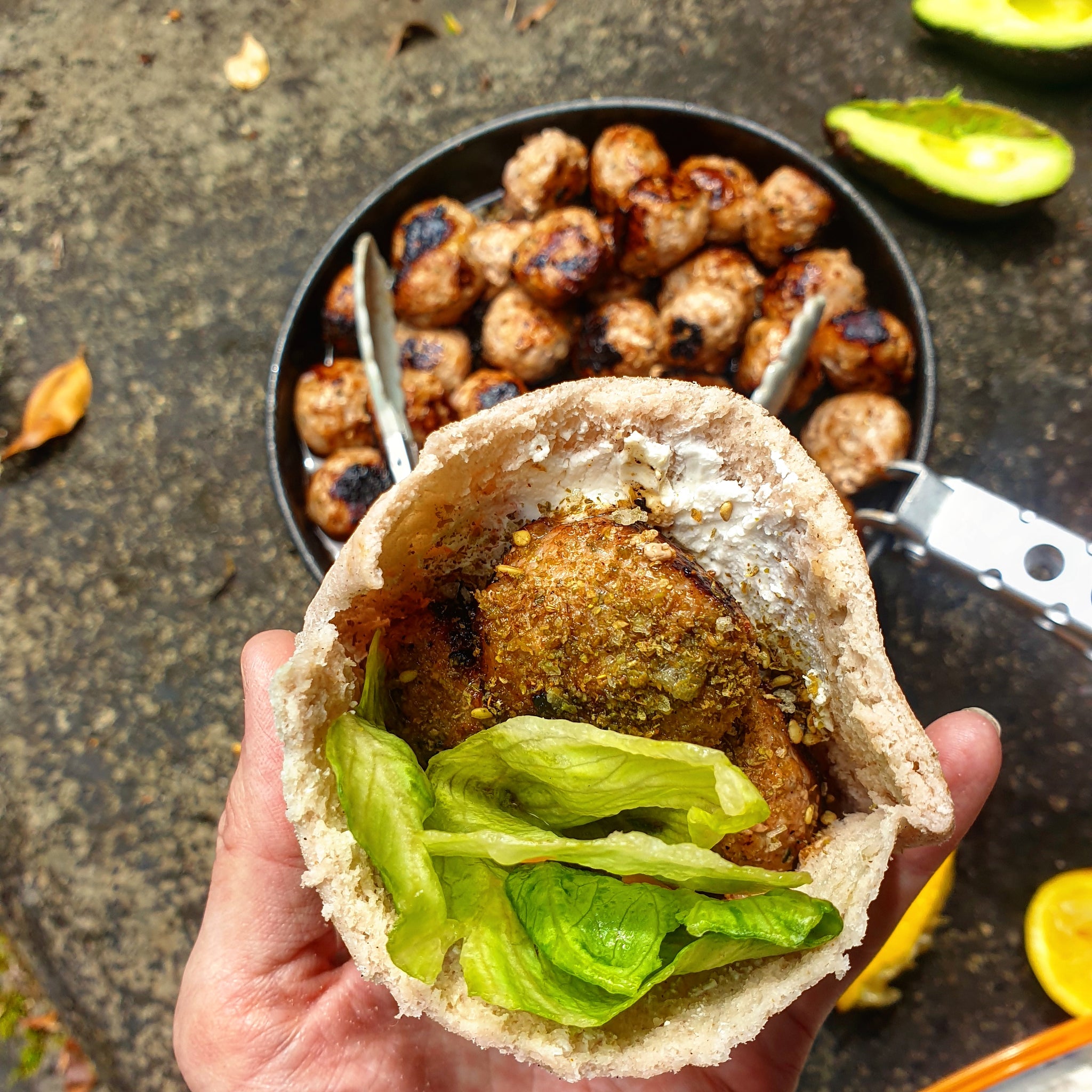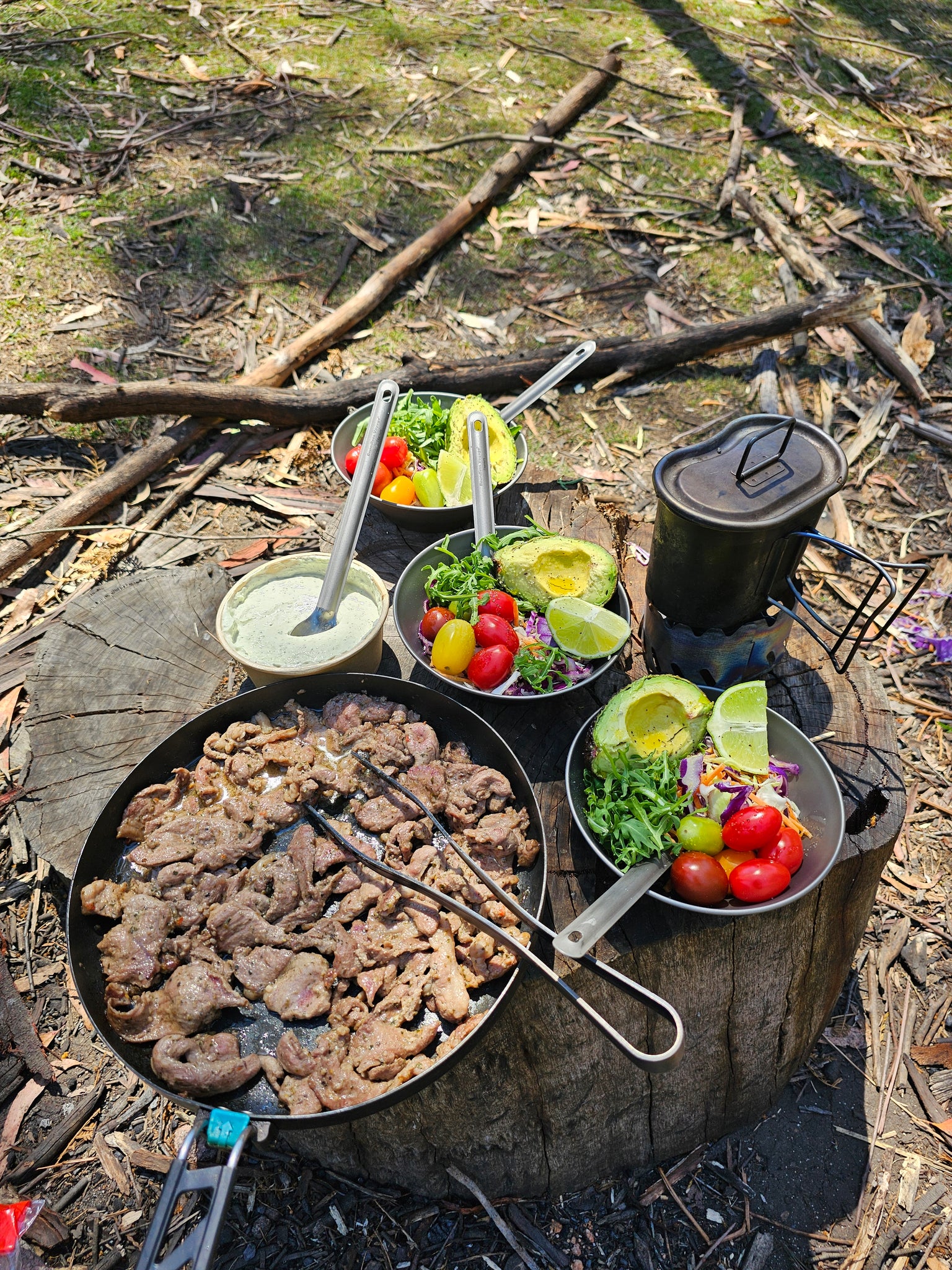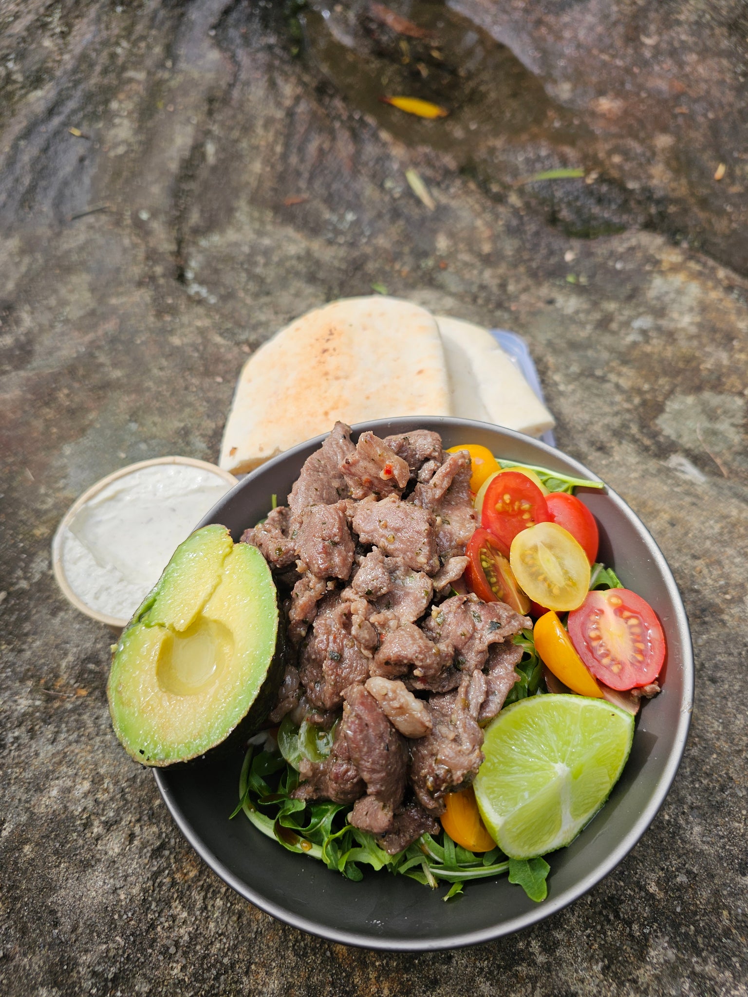 Cooked lunch is usually hot grilled lamb strips and slaw with dip and bread. Cooked on trail. Haloumi, falafel, beef or pork are also available.